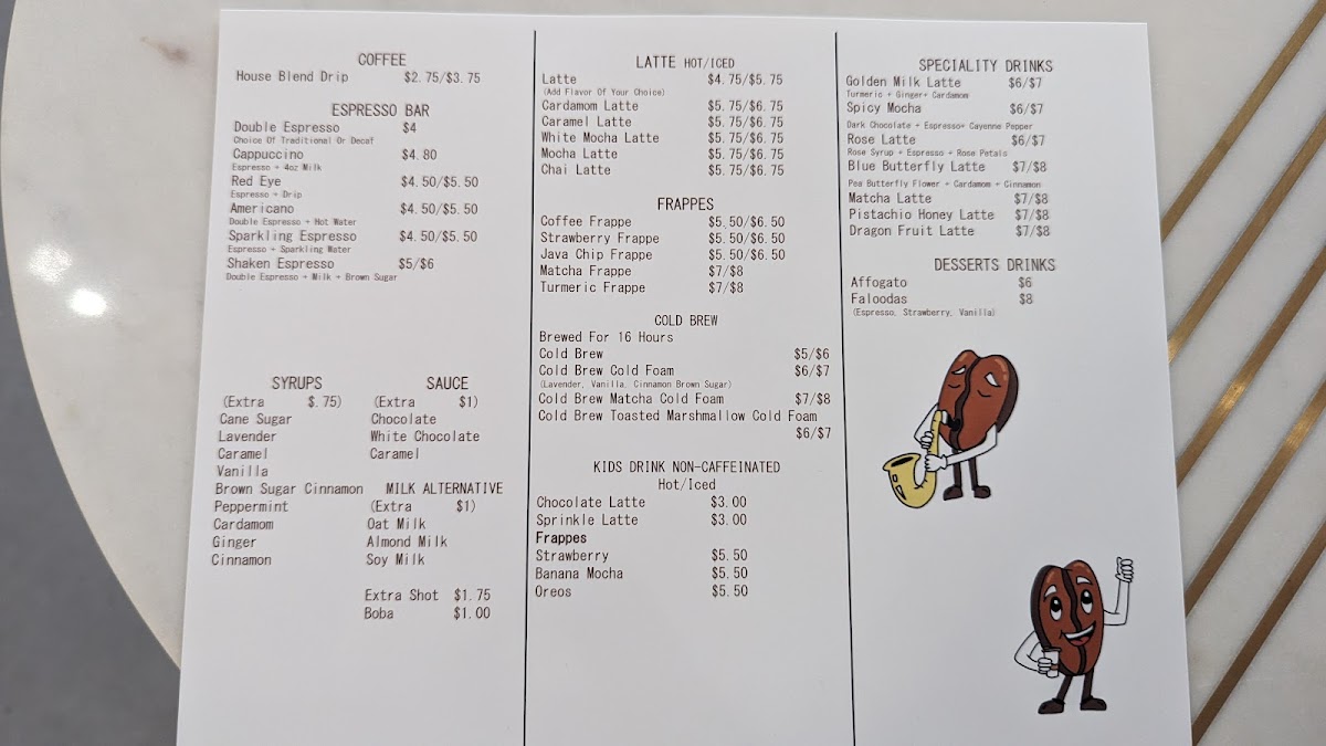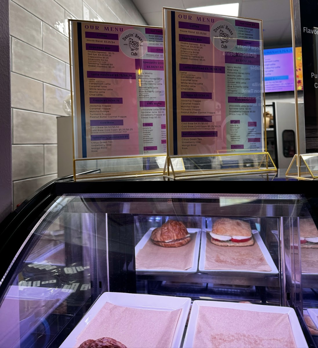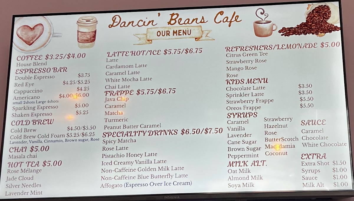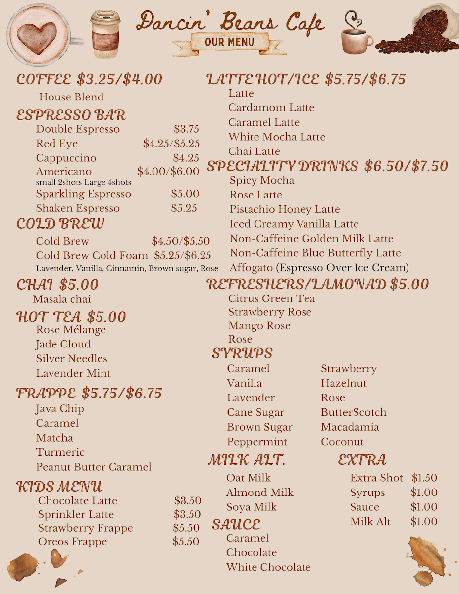 Dancin’ Beans at Glade Parks offers a menu that effortlessly balances comfort and creativity, making it a standout spot for both casual visits and special treats. For breakfast or brunch, the Toast options like Avocado Toast and Nutella Berry Toast pair beautifully with the Sandwiches, including Roasted Turkey & Cheese and Ham & Swiss Cheese, while those with a sweet tooth will enjoy the Almond Butter Berries, Peanut Butter Berries, and Fruitella Sandwich. The Bakery Specials elevate indulgence with items such as the Gourmet Spiral Croissant Chocolate, Gourmet Spiral Croissant Pistachio Cream Filled, Almond Croissant, and Chocolate Croissant, complemented by the Mixed Dessert Basket and Mixed Bakery Basket for sharing. Younger guests are well-catered for with playful options like the Chocolate Latte, Sprinkler Latte, Strawberry Frappe, and Oreo Frappe. Beverage lovers are spoiled for choice: seasonal Fallvibes drinks feature Maple Frappe, Pumpkin Spice Latte, Pumpkin Pie Latte, Pumpkin Spice Frappe, and Maple Pumpkin Affogato, while the coffee selections include House Blend, Double Espresso, Red Eye, Cappuccino, Americano, Sparkling Espresso, and a variety of Lattes and Specialty Drinks like Spicy Mocha, Rose Latte, Pistachio Honey Latte, Matcha Latte, and Creamy Vanilla Latte. Tea enthusiasts can enjoy Masala Chai, Rose Melange, Jade Cloud, and Silver Needles, while refreshers like Citrus Green Tea, Strawberry Rose, and Mango RoseRose provide light, fruity options. Cold coffee fans will find both classic and inventive choices with Cold Brew and Cold Brew Cold Foam, and the frappe lineup-including Java Chip Frappe, Caramel Frappe, Matcha Frappe, Turmeric Frappe, and Peanut Butter Caramel Frappe-offers sweet, creamy satisfaction. Overall, Dancin’ Beans’ menu demonstrates a thoughtful blend of sweet and savory, classic and creative, ensuring there’s something to delight every palate.